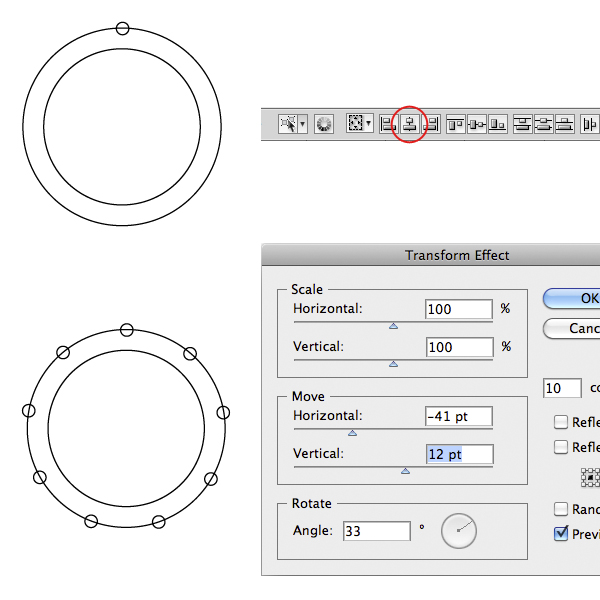 Now select the small circle and in the Menu Bar click Effect > Distort and Transform > Transform. Set the copies value to 10, Horizontal to -41pt, Vertical to 12pt and Angle to 33 degrees. You may need to play with those values until you align correctly the circles like below. This step will be very frustrating if you’ve never used this feature before. My advice is to experiment until you get a nice result, otherwise you can simple duplicate the circle and place it where you want. The trick is: if you decrease Horizontal value increase Vertical and vice versa.