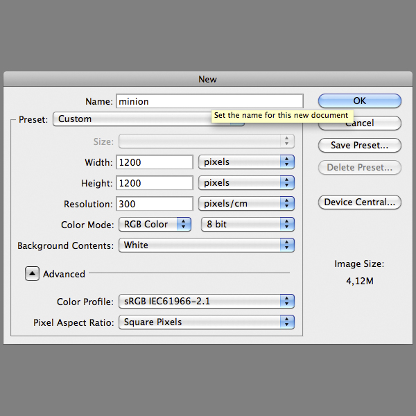 Create a 1200x1200px document in Photoshop set the resolution to 300dpi and color mode to RGB. (Cmd/Ctrl + N).
