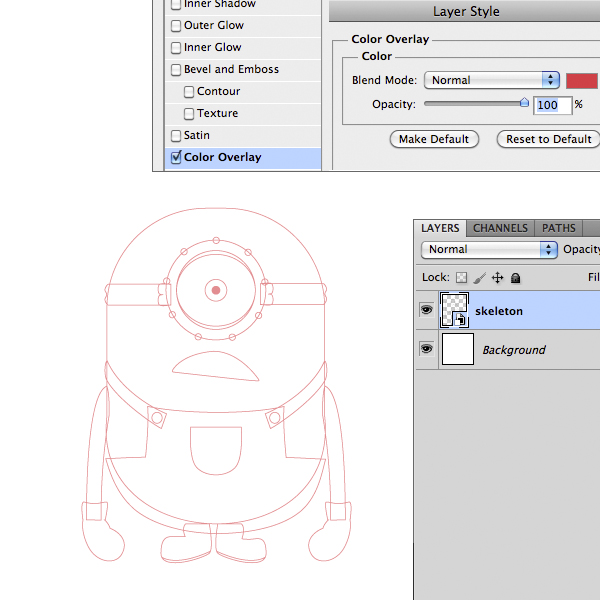 Now open the previous skeleton.ai file and select the entire skeleton. Let’s do a copy and paste into Photoshop, be sure to select Smart Objects in the pop-up window that appears. Now double click on the layer in Layers Panel to open the Layer Style window. Check the Color Overlay style and select a red color, press the Ok button to confirm. Rename the layer "skeleton" and lower the opacity to 60%. We will use it as a reference to adjust the various elements. Put this layer on top.