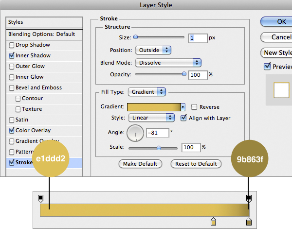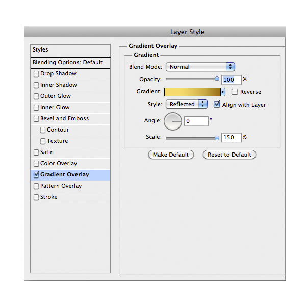 Let’s do the fun part now. Rename the imported layer "body" and double click on it (always stay organized with layers, in this project there are more than 70). In the Layers Style windows check Gradient Overlay and set it as image below. The color for the gradient are #f6da6e and #9a701b. Press Ok to confirm.