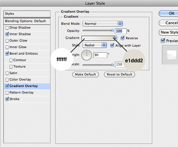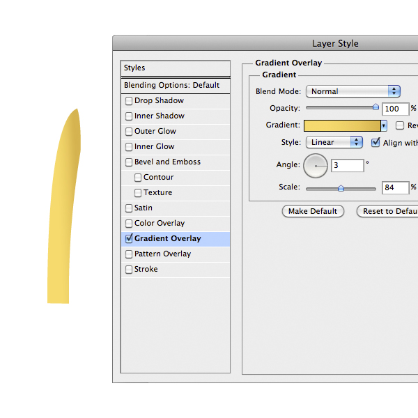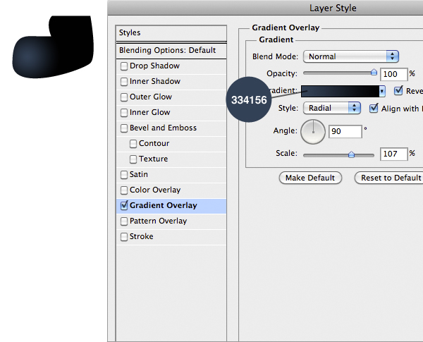 Import the left shoe now, without the curved line. Add the following Layer Style. (To move the gradient simply drag it once you open the Layer Style panel in the Gradient Overlay tab).