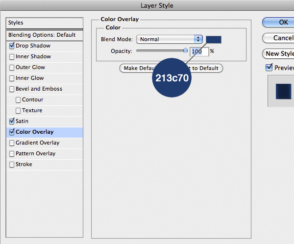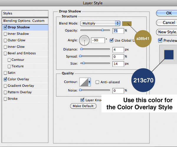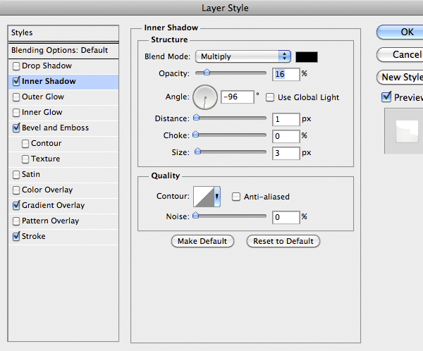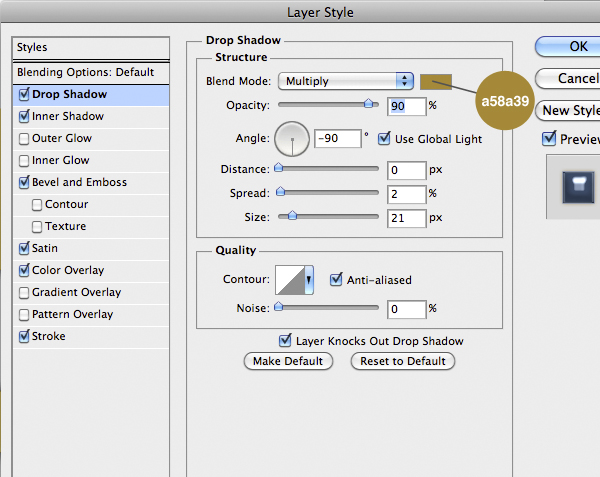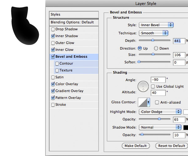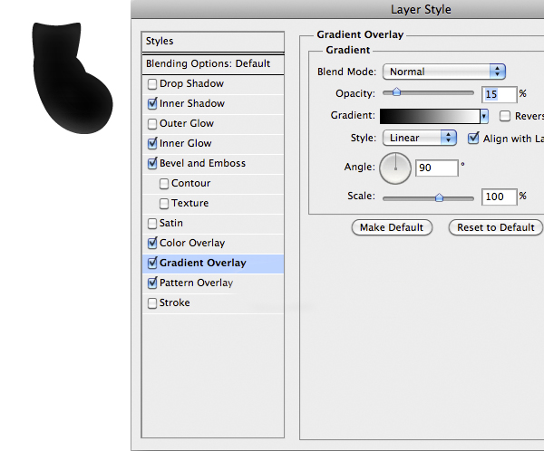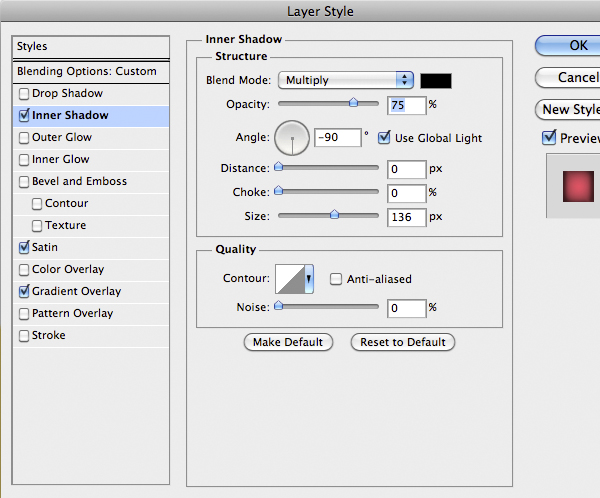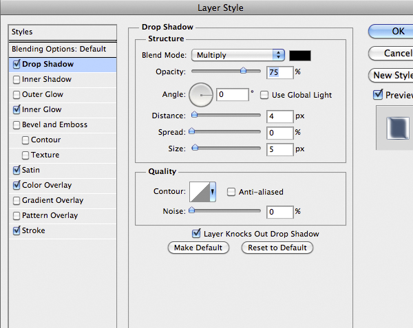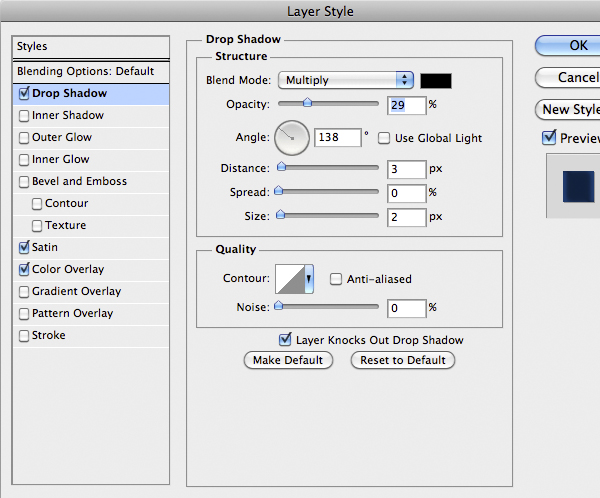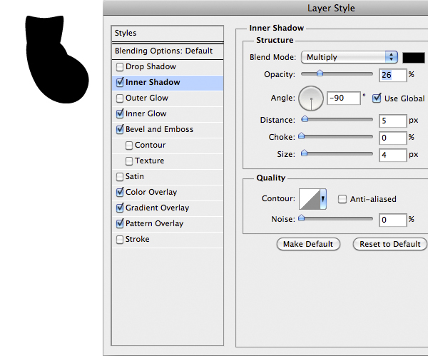 Now is time to do the first part of the suit. Import the center part and add the following style. You’ll notice that the drop shadow comes out from the edges of the suit. To fix it on the Menu Bar select Layer > Layer Style > Create Layer to isolate the individual layer style into layers. This is a very nice feature, useful in cases like this. So just use the Eraser Tool (E) on the shadow layer to fix the problem.