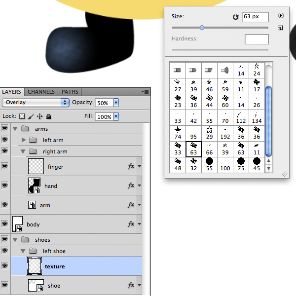 Create a new empty layer, select the Brush Tool (B), right click on the image to open the Brush Tool Option Panel and choose a grunge brush. Let’s paint with white to add some detail, then lower the opacity to 50% and set the blending mode to Overlay to gain much deeper color.