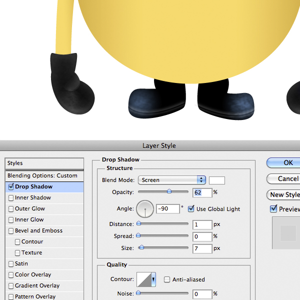 To add more detail to the shoe import the curved line, add this Layer Style and decrease the fill of the layer to 0%. You have to repeat step 23-24 for right shoe (simply import it and add the previous Layer Style by dragging it in the imported shoe layer while holding down the Alt key). Although, you have only to duplicate and reflect the left shoe, and change the gradient position.