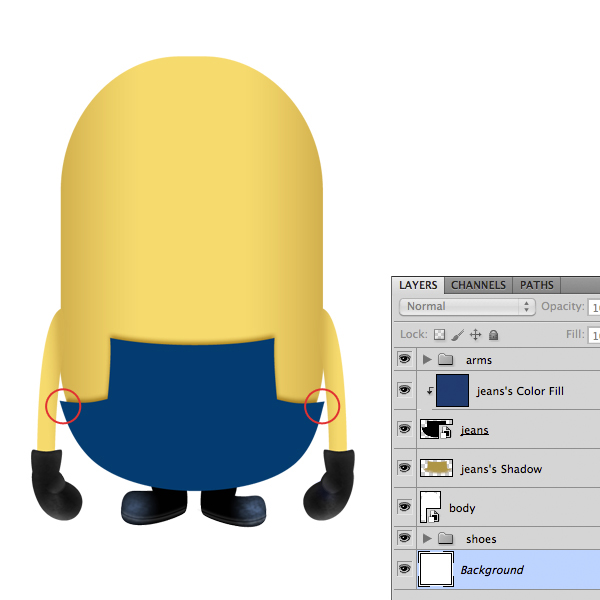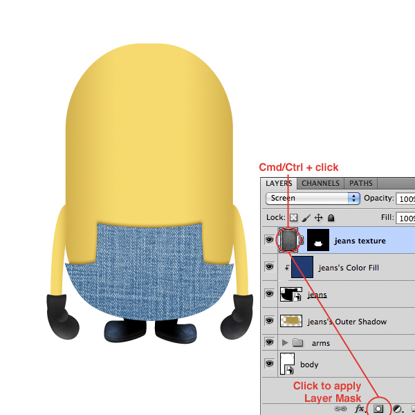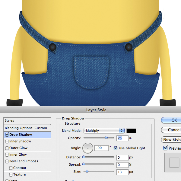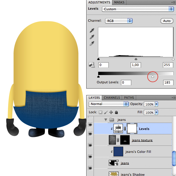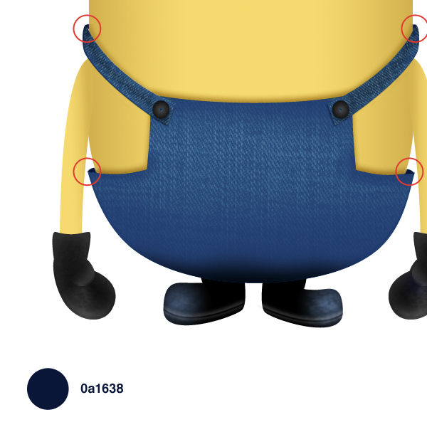 To give a more realistic look to our minion we have to texturize it. So open up the jeans texture in another document, desaturate it by pressing Shift + Cmd/Ctrl + U. Then copy and paste the texture inside the minion document and adjust it like below.