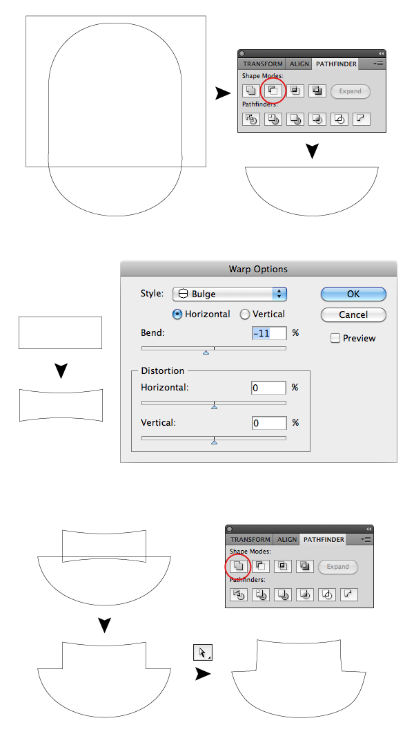 For the second one, draw another rectangle and on the Menu Bar select Effect > Warp > Bulge. Set Horizontal and Bend to -11%, leave the rest to 0, click Ok button to confirm. Select the rectangle and in the Menu Bar let’s click on Object > Expand Appearance.