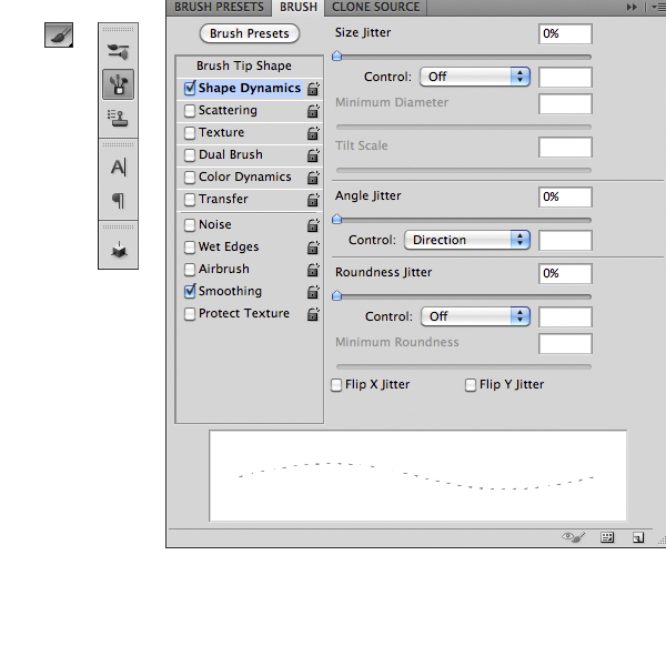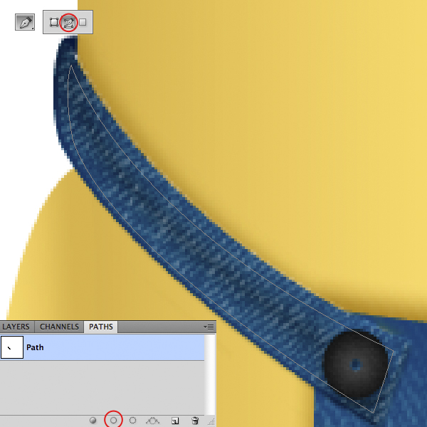 Create a new layer. In the Brush Panel choose the string brush. Next select the Pen Tool (P) in paths mode and draw a path like below in the shoulder strap. Open the Path Panel, select the path and press the Stroke Path Button, be sure to select Brush from the pop-up window and uncheck Simulate Pressure. If you want bigger string just increase the brush size of the Brush Tool.