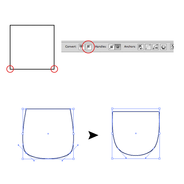 With the Rectangle Tool (M) draw a square (hold down Shift while dragging). Then use the Direct Selection Tool (A) to select the two bottom points and press the Convert Button in the Option Bar. Adjust the handles until you get a result like the image below. (You don’t need to do those shapes exactly as I do, because the aim of this tutorial is to create a pack of different minions, so follow my guidelines but try to customize your minion too).