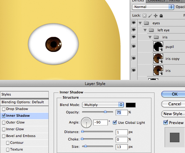 Duplicate the monocle layer and place it as the image below. Create a new layer. Then load the selection of the two monocle layers, Cmd/Ctrl + Shift + click on the thumbnails of the layers. Fill the selection with black and apply the same Layer Style of the monocle layer, change only the value as show below. Obviously, add the other eye too.