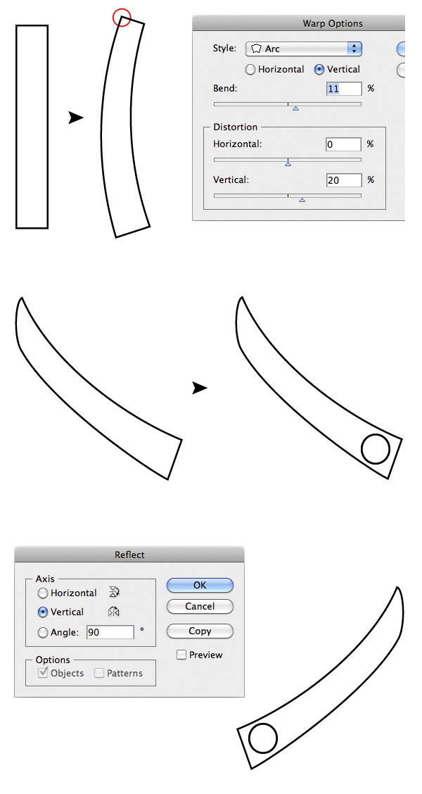 For the shoulder strap let’s draw another rectangle. Then in the Menu Bar select Effect > Warp > Arc set Vertical; Bend to 11% and Vertical Distortion to 20%. Remember to Expand Appearance like before or when you will try to rotate or transform this object the effect will be re-applied with some unwanted results.