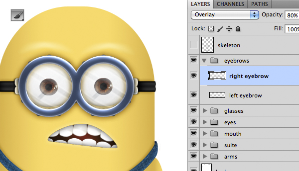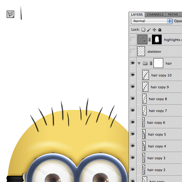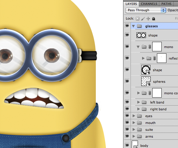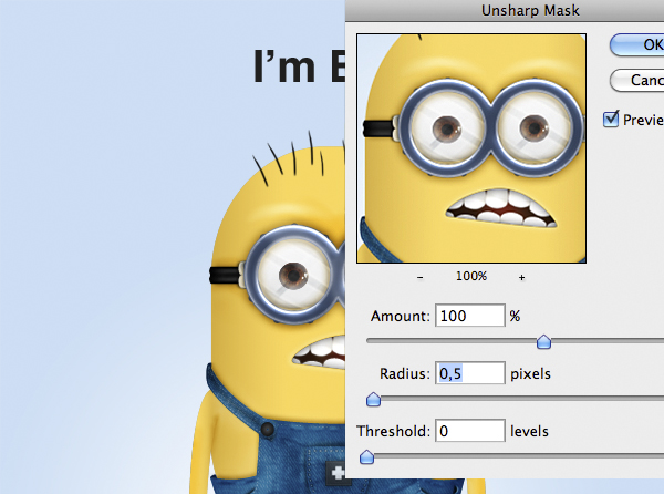 Remember you can always change the shape of your minion by double clicking thumbnail icon in a smart objects layer to open the connected vector file in Illustrator. Do this before applying the unsharp mask. Having regard to the fact that the minion will be used as an icon, it will be appropriate during the resizing to re-apply the unsharp mask. Be careful not to exceed with the values.