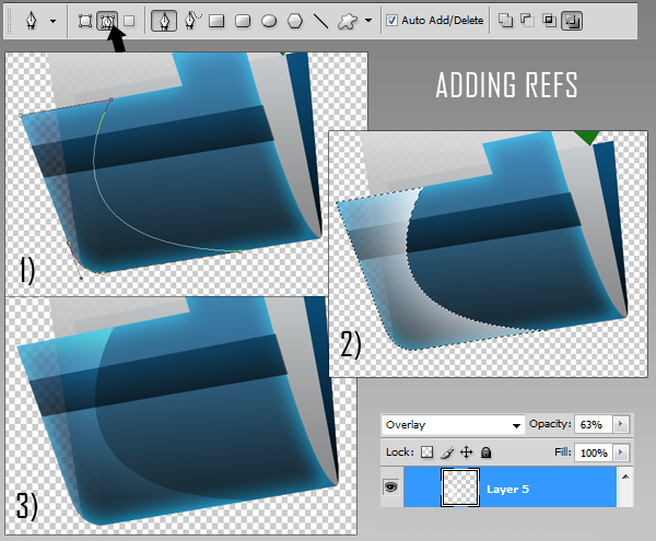 Add a new group named "refs." Use the pen tool to draw reflections as shown. Make sure you draw your shapes as paths instead of shape layers (see arrow). After you have closed the path, right-click on the workspace and choose "make selection" (feather 0). Pick up a big brush (master diameter around 470, hardness 0) and brush round the right part of the selection as I did creating a white reflection. Change the blending mode to Overlay and reduce the opacity to 63%.