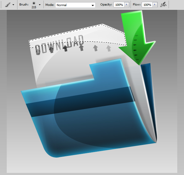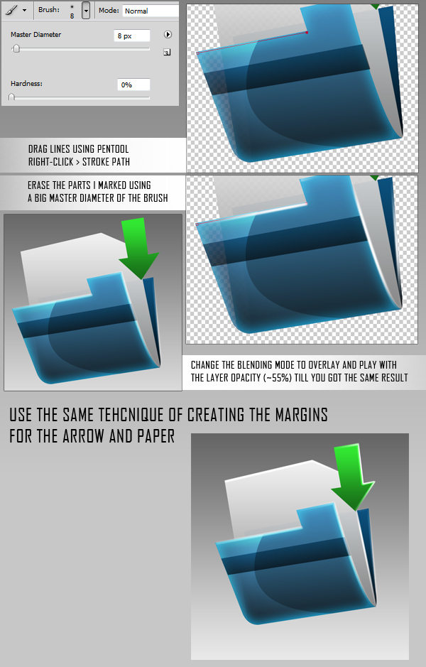 Create a new group named "margins," create a new layer in it (Command/Ctrl + Shift + N). Adding highlights on the margins emphasizes the effect of the 3d icon. Use the pen tool to create the stroke lines around the corners and all the margins of the folder, paper and arrow. Then, right-click on the workspace and choose stroke path – brush. The brush settings must be changed to 8 px master diameter, hardness 0.