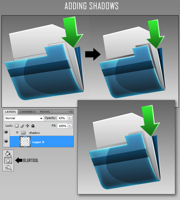 Create a new layer (Command/Ctrl + Shift + N) for shadows and place it into a new group (Command/Ctrl + G). Make selection as you did in step 5 for creating reflections. Fill the selections with black and then blur the margins using the blur tool. If the shadows look too strong, it means that you must lower the opacity of the layer to 40%.