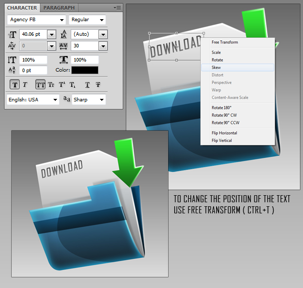 Add text using whichever font you like. In this case, I chose "Agency FB." Font size: 40, Layer Opacity: 75%.
