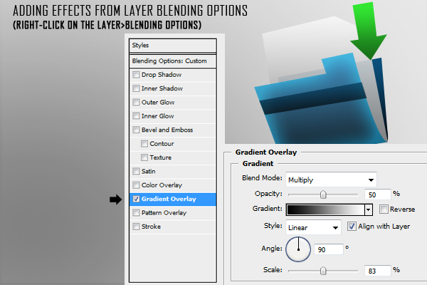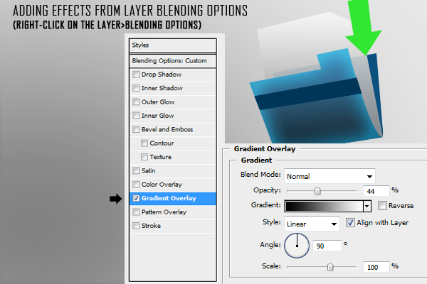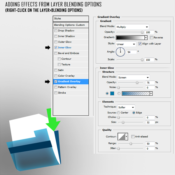 Add the following layer styles to the front part of the folder. Lower opacity to 90%.