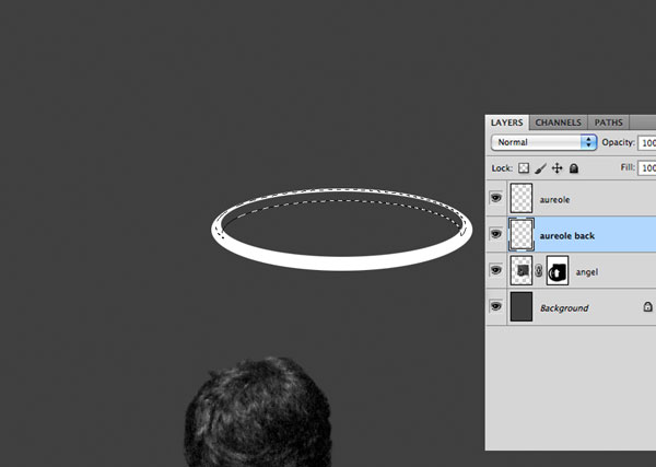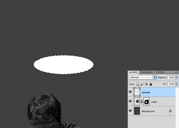 Now let’s create an aureole for the angel. Create a layer called aureole and with the Elliptical Marquee Tool (M) make an oval selection and fill with white.