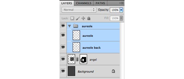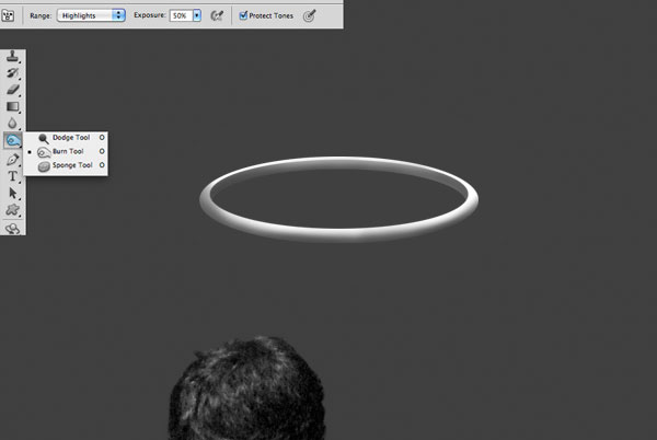 Use the Burn Tool (O) in Highlights mode to create the lights and shadows of the halo. In the end you should have something like the image below. After that, group the two layers of the aureole to keep your file organized.