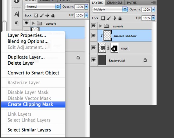 Now we need to make the shadow of the halo. Create a layer and position it above the layer "angel." Right click on the layer and create a "Clipping Mask." Set the blend mode "Multiply" and with a Soft Brush (B) paint the angel’s head trying to simulate a shadow.