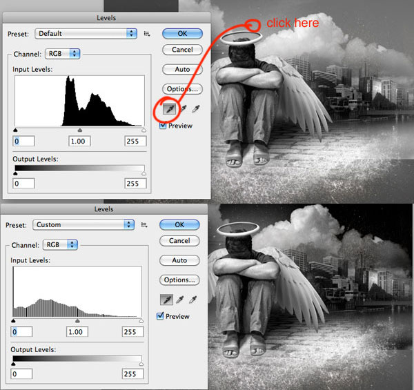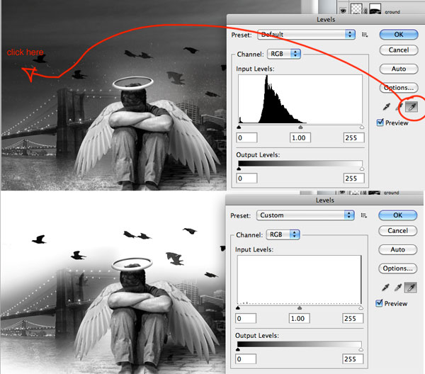 Place the Birds image. Desaturate it using the same technique as shown previously in this tutorial. Then go to Image > Adjustments > Levels and use the White Eyedropper to set the White Point of the image.