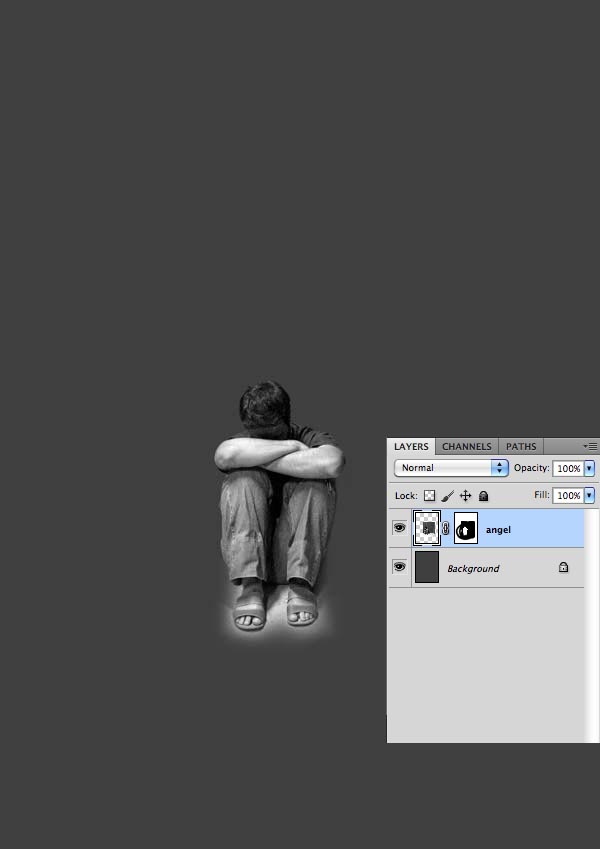 After creating the background, the first thing to do is extract the boy by using your favorite tool. I made a selection using the Polygonal Lasso Tool (L) and then applied a mask. No need to be very precise on this selection, because the boy will merge with the rest of the image. In the area of the feet you can leave some details such as the shadow between her legs, and remove the excess using a soft brush (B).