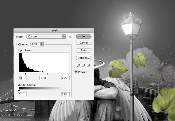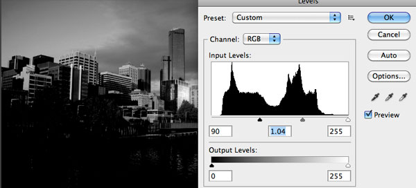 Open the city file, desaturate it using Command/Ctrl + Shift + U. Then go to Image > Adjustments > Levels to darken the image.