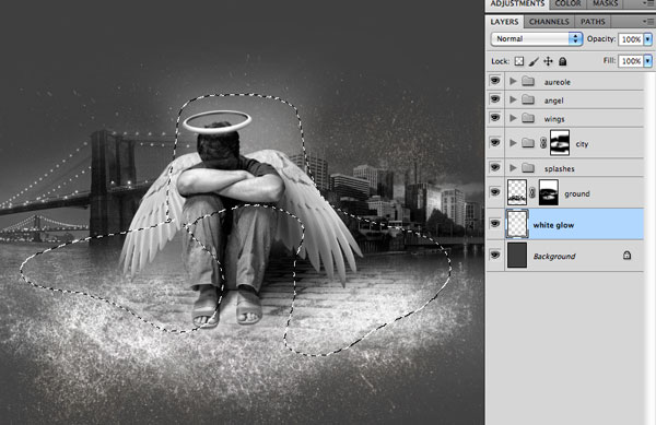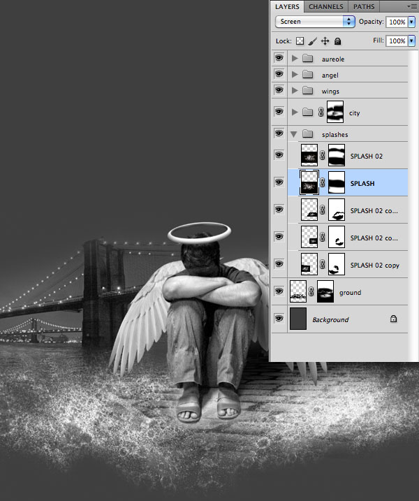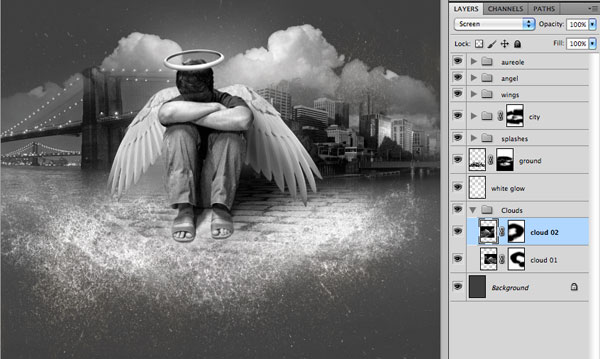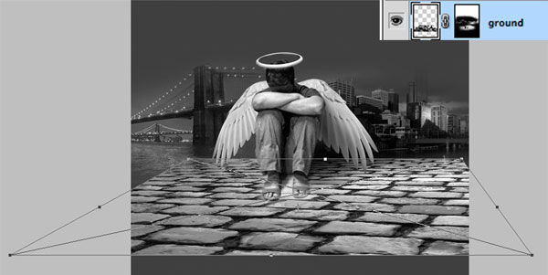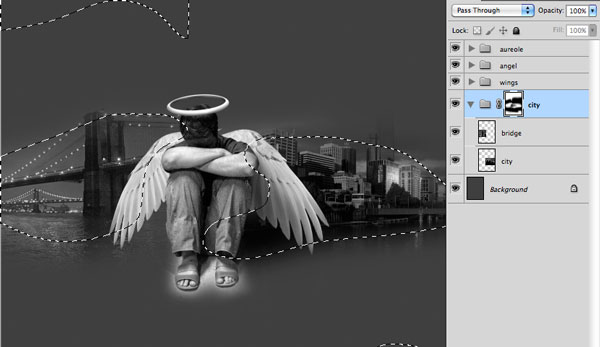 After that, position the bridge behind the angel and the city like the image below. Group the two layers and create a mask to hide in the image edges.