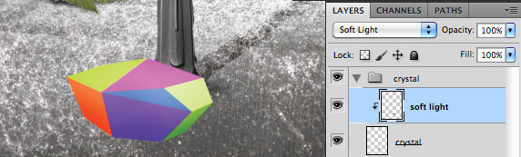 Open Illustrator and create the colored crystal. After you’ve created it, copy and paste into Photoshop. Create a new layer and set the blending mode to Soft Light and click with the right button to create a Clipping Mask. Use a Soft Brush (B) with Black (to darken) or White (to brighten) in some areas of the crystal. This technique is very useful if you do not like to use the Dodge and Burn, because this way you can correct mistakes whenever you want. It gives you much more flexibility.
