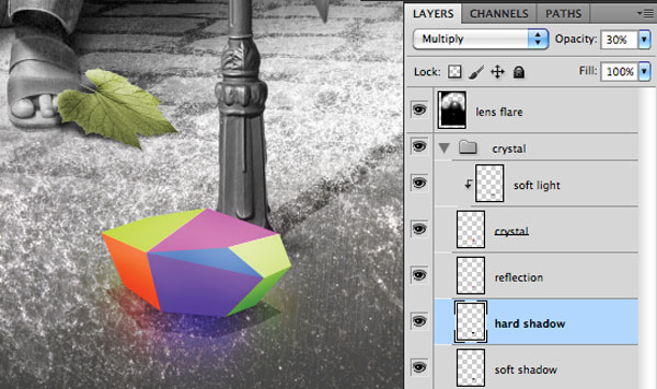 Duplicate the crystal layer to make the reflection and put it under the original crystal. Set the blending mode to Linear Dodge, change the opacity to 50%, apply Filter > Blur > Gaussian Blur and use a radius of 35 pixels. After that create a Hard Shadow (Multiply and opacity of 30%) and a Soft Shadow (Multiply and opacity of 80%) under the crystal.