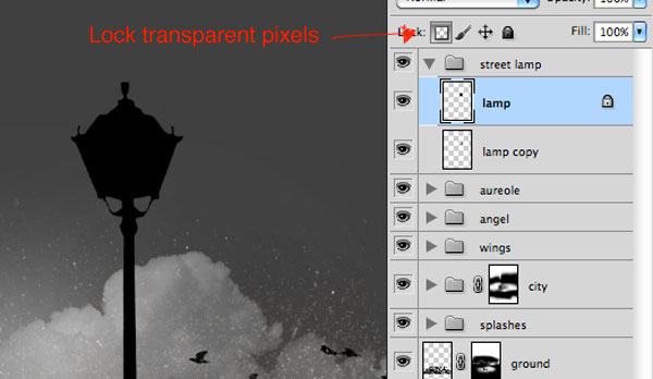 Open the Street Lamp image and extract it from the background. Place it into your main file on top of all layers. Now we are going to make the shadow. Duplicate the lamp, set your foreground color to black and fill the lamp copy locking transparent pixels.