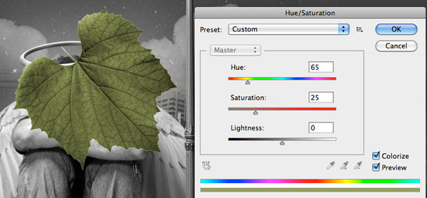 Now we have to add the "flying" leaves to the composition. Open the Leaf image, extract it from the white background (I used Color Range) and then go to Image > Adjustments > Hue/Saturation and use the configuration below.