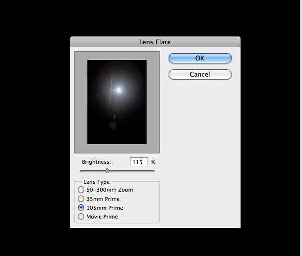 Now we are going to add the lens flare effect to the lamp. Create a new layer and fill it with black. Go to Filter > Render > Lens Flare and use the following configuration.