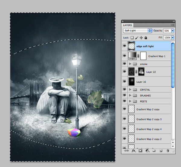Now create a new layer, set the blending mode to Soft Light, the opacity to 50% and paint with a large Soft Brush around the edges.