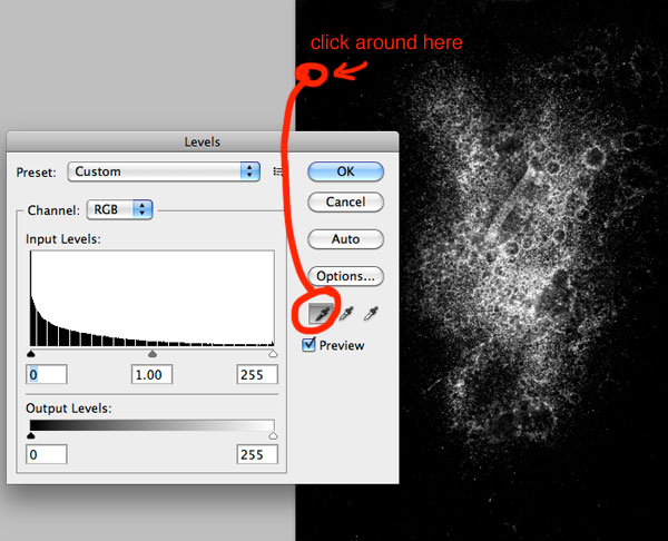 Open the Spatter image and desaturate it using Command/Ctrl + Shift + U. Invert the image color with Command/Ctrl + I. Then go to Image > Adjustments > Levels. At the levels window click at the black eyedropper and click in the black area as shown in the image.
