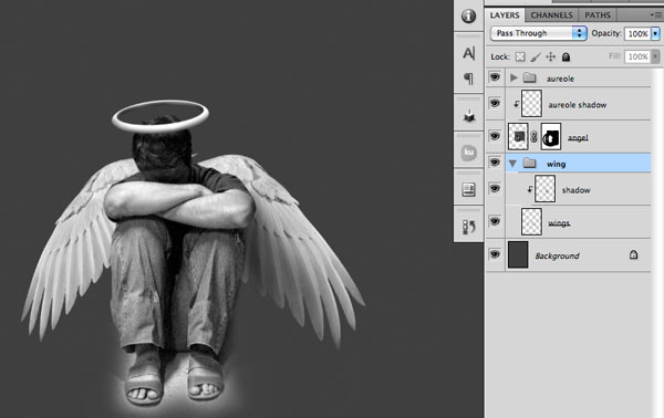 Create a New Layer, set it to "Multiply" and then create a "Clipping Mask". Use a Soft Brush (B) with Black and paint over the wing to create the shadow of the boy. Don’t forget to group the "Wings" layer and the "Shadow" layer.
