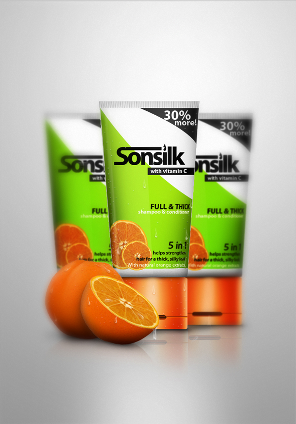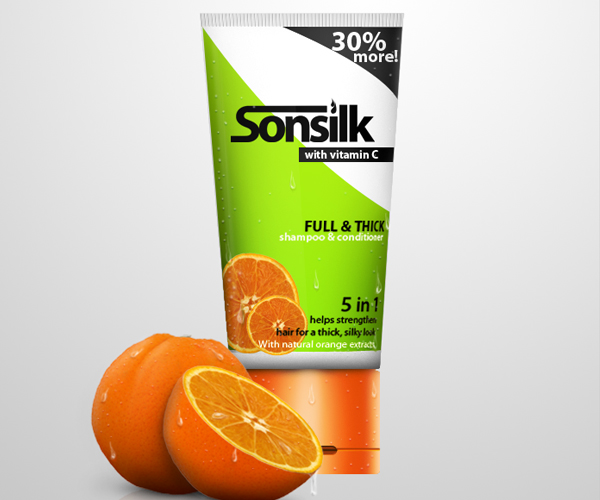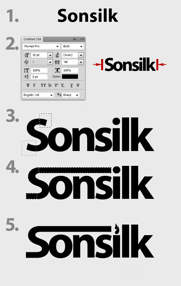 Next is to add the brand. Using the Type tool (T), set to a font family of Myriad Pro and font style of Bold, type the name of the brand that you like, in this case Sonsilk, Fig. 1. Next go the Character settings tab then change the Tracking value to -80. This will, in effect, decrease the distance of each letter within the word, Fig. 2. Next, right-click the layer of "Sonsilk" then select Rasterize type from the drop down menu. With this, the Sonsilk layer can know be directly edited. I decided to add a little more style with the brand, so I used the Rectangular Marquee tool (M) to delete the upper and lower end points of the letter "S", Fig. 3. Then, using again the Rectangular Marquee tool (M) make a rectangular shape that’ll serve as the new extensions of both the end points we just deleted, Fig. 4. The final effect should like Fig. 5. As you can see I also change the dot for the letter "I" and turn it into a wavy shape.
