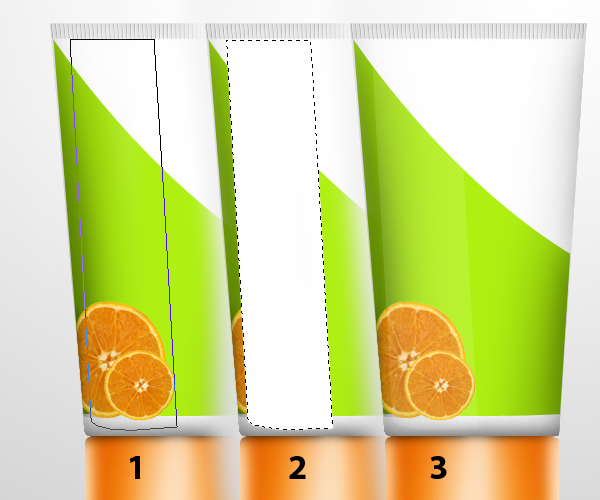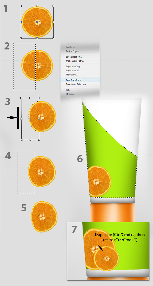 Next, resize the “Orange” layer by pressing Command/Ctrl + T, Fig. 1. Next, using the Rectangular Marquee tool (M), select about half of the orange then press right-click then select Free Transform from the dropdown menu, Fig. 2. Resize the selected area just like as shown in Fig. 3. Do the same process, but now only selecting at least 1/4 of the orange, Fig. 4. The Final effect should look like Fig. 5. Position the modified orange image on the lower left portion of the bottle. Next, by Command/Ctrl + Clicking the thumbnail of the “Greenstrip” layer, it’ll activate the selection marquee around the outline of the object. Next, press Command/Ctrl + Shift + I to inverse the selection then hit delete. The final effect should look like Fig. 6. Finally, duplicate this layer and resize it, just like what is shown in Fig. 7