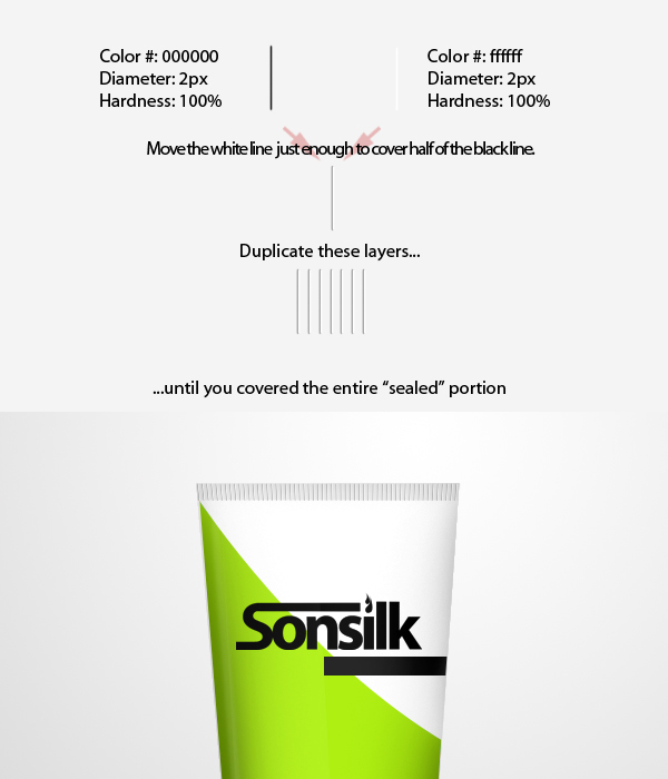 Next step is to add the tiny ridges for the "sealed area" we did earlier. To do this, first make a line using the Pen tool (P). Next, press right-click then select Stroke Path from the dropdown menu. Select the Brush as the tool for making the stroke. Do this process for making a black line (#000000) and a white line (#fffffff) following the brush settings prior to using the Pen tool (P). Make sure to do this in two separate layers. Next, move the white line just enough to cover half of the black line, then merge these two layers. Duplicate these layers until you covered the entire "sealed" portion.