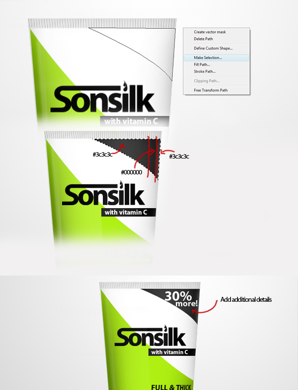 The upper right corner of our shampoo bottle design seems empty, so I added another strip to add additional information. Using the Pen tool (P) define the shape of the strip, press right-click then select Make Selection from the dropdown menu. Next, color the selected area with the corresponding color numbers indicated below. Lastly, add some additional text or information.
