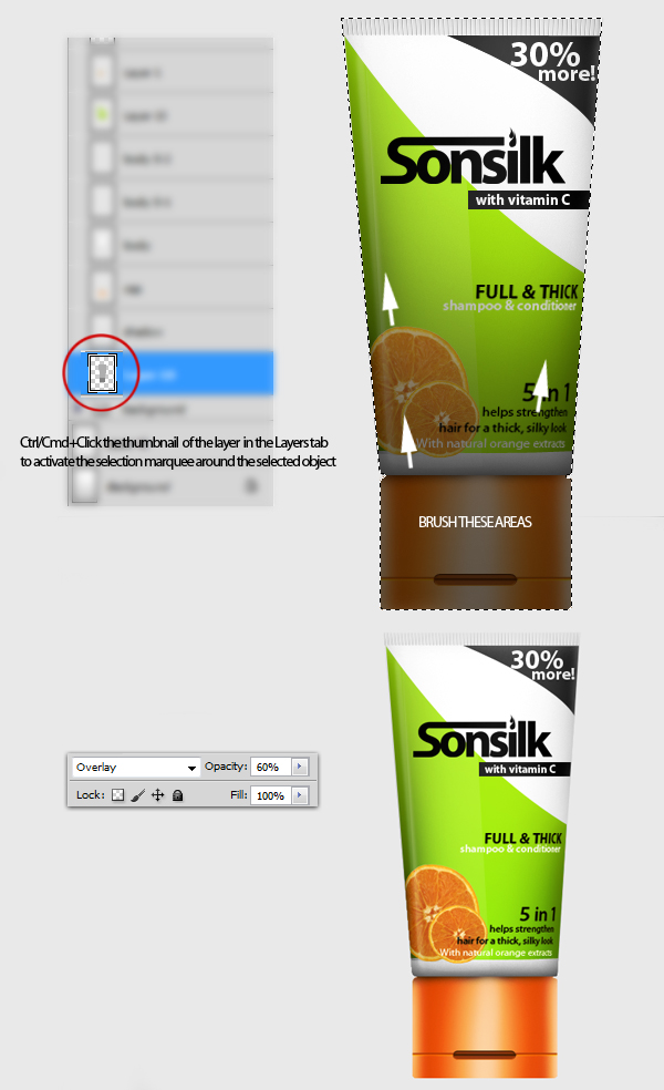 Next step is to add additional dark shadings and contrast on the lower portions of the bottle. To do this, first, press Command/Ctrl + click the thumbnails of both the "Main" and "Cap" layer to activate the selection marquee around the objects selected. Next, using the Brush tool (B) set to a size of 500px and Hardness of 0%, paint lightly on the lower parts of the selection. Lastly, change the layer’s Blend mode to Overlay then decrease its Opacity level to ~60%.