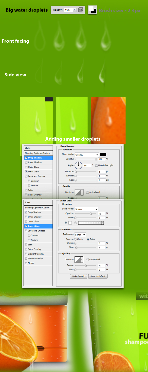 Next, let’s add some water droplets for the main bottle and the oranges. Using the Brush tool (B) with a size of ~3-5px and hardness of ~30%, follow the procedure below on how to digitally paint a basic water droplet. After that, using a brush set to a size of ~3px and hardness of 100% following the layer settings below, add some smaller water droplets or effusions.