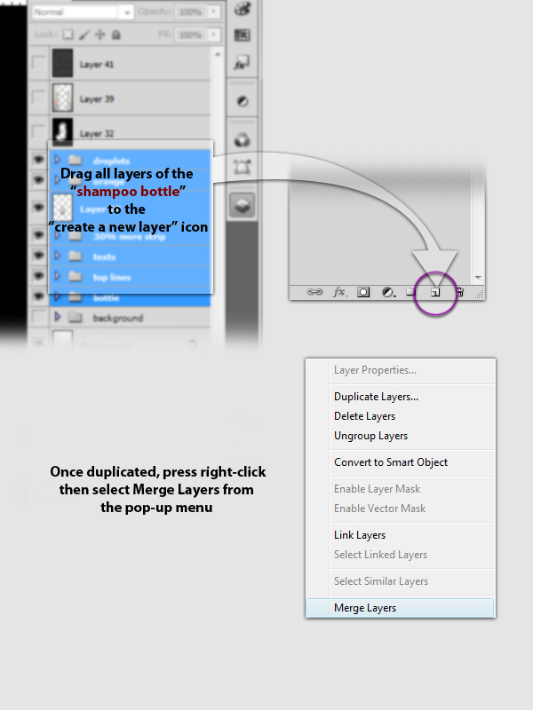 Next, select all layers that make up the entire main bottle in the layers tab. Once selected, drag the selected layers on the Create a New Layer icon. This will duplicate all layers selected. Lastly, press right-click then select Merge Layer from the dropdown menu.