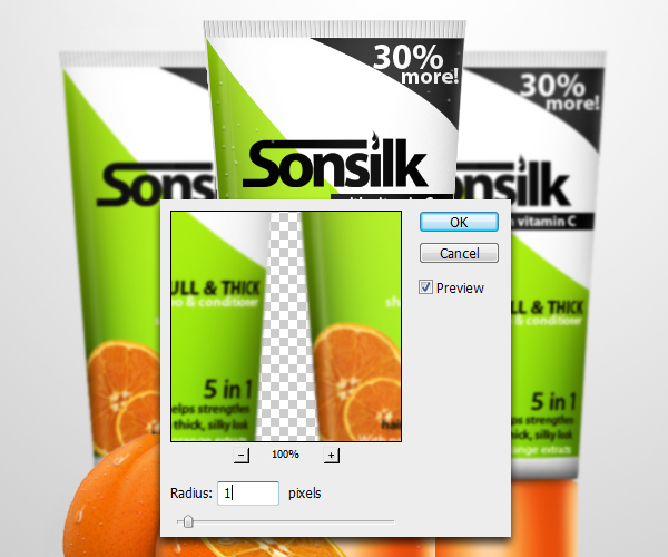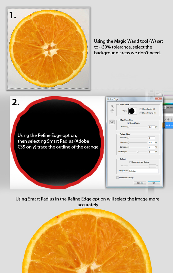 Next step is to add additional details for our bottle, in this case a cross-sectional view of an orange. To start, using the Magic Wand tool (W), select the areas we don’t need, just like as shown in Fig. 1. Next, after you defined the selection, click Refine Edge. On the Refine Edge window, select Smart Radius then follow the outline of the orange, just like as shown in Fig. 2. The finish product is shown below. In addition, duplicate this layer then hide the duplicate for the mean time. We did this because we’ll use the duplicated orange layer later for additional effects we want to achieve.