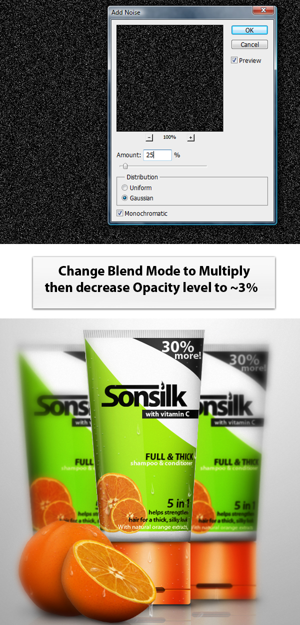 For the last step, we’ll add a subtle amount of noise to somewhat add a blend effect for all the layers. To do this, first add another layer then using the Paint Bucket tool (G) fill the entire selection with color #000000. Next, go to Filter > Noise > Add Noise then follow the indicated value below. Finally, change the layer’s Blend Mode to Multiply then decrease its Opacity level tp ~3%.