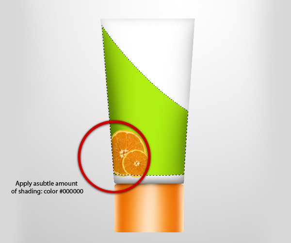 Like what we did in the previous steps, press Command/Ctrl + Click the thumbnail of the “Greenstrip” layer to activate the selection marquee around the entire outline of the object. Next, using a soft-medium sized brush with color number close to #000000, apply a subtle amount of shading in the corner area where we placed the oranges just like as shown below.
