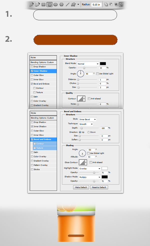 Next is to add the recessed area for the cap. To do this, using the Rounded Rectangle tool (U) set to a radius of 0.15 inches, make an oblong shape just like as shown in Fig. 1. Next, using the Paint Bucket tool (G), fill the entire selection with color #a34100 then decrease its Fill opacity to ~82%. Next, follow the Layer settings indicated below. Press Command/Ctrl + T to resize it just like as shown below.