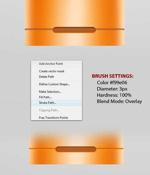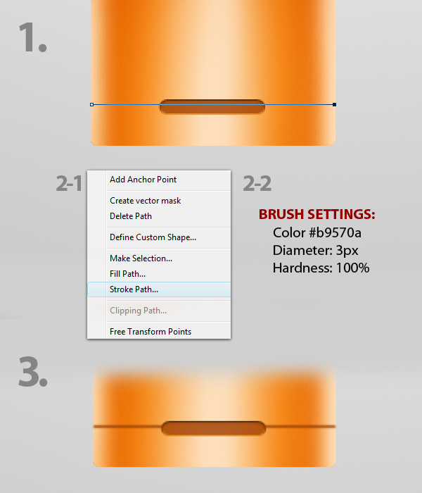 Next, using the Pen tool (P) make a line like as shown in Fig. 1, then go to the Brush tool (B) then change its settings with the values indicated in Fig. 2-2, then return to the Pen tool (P), press right-click then select Stroke Path from the dropdown menu, Fig. 2-1. Select the Brush as the tool for making the stroke. The final effect should look like Fig. 3.