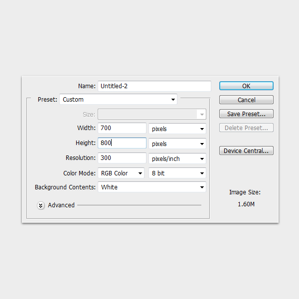 Start by creating a file with a size of 700×800 pixels and a resolution of 300ppi.
