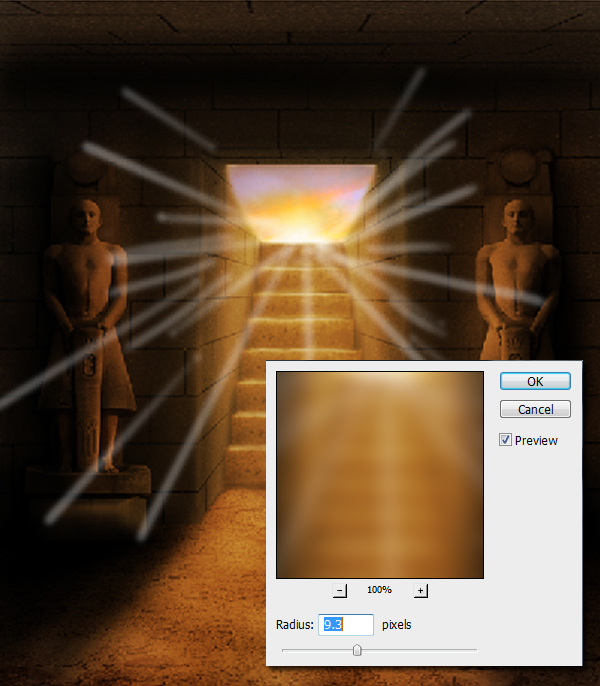 Next, using a small brush with hardness level of ~70%, paint some light rays coming from our main light source just like as shown below. Next go to Filter > Blur > Gaussian Blur, then apply a 9.3 pixel blur level.