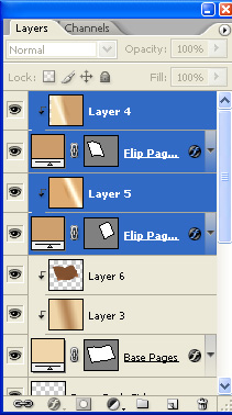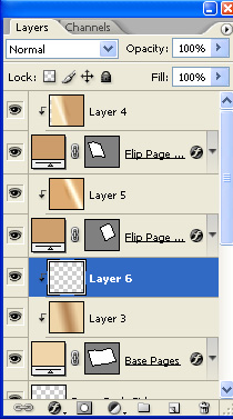 Now press Command/Ctrl + E to merge them all into one. Re-name this new layer to "Flip Pages". Oh, one tiny thing, in the process of doing the merging, it is possible that your layer will become a Clipping Mask to the "Pages Base" layer, so just right-click on it and choose Release Clipping Mask. Now the Layers Palette should look like so.